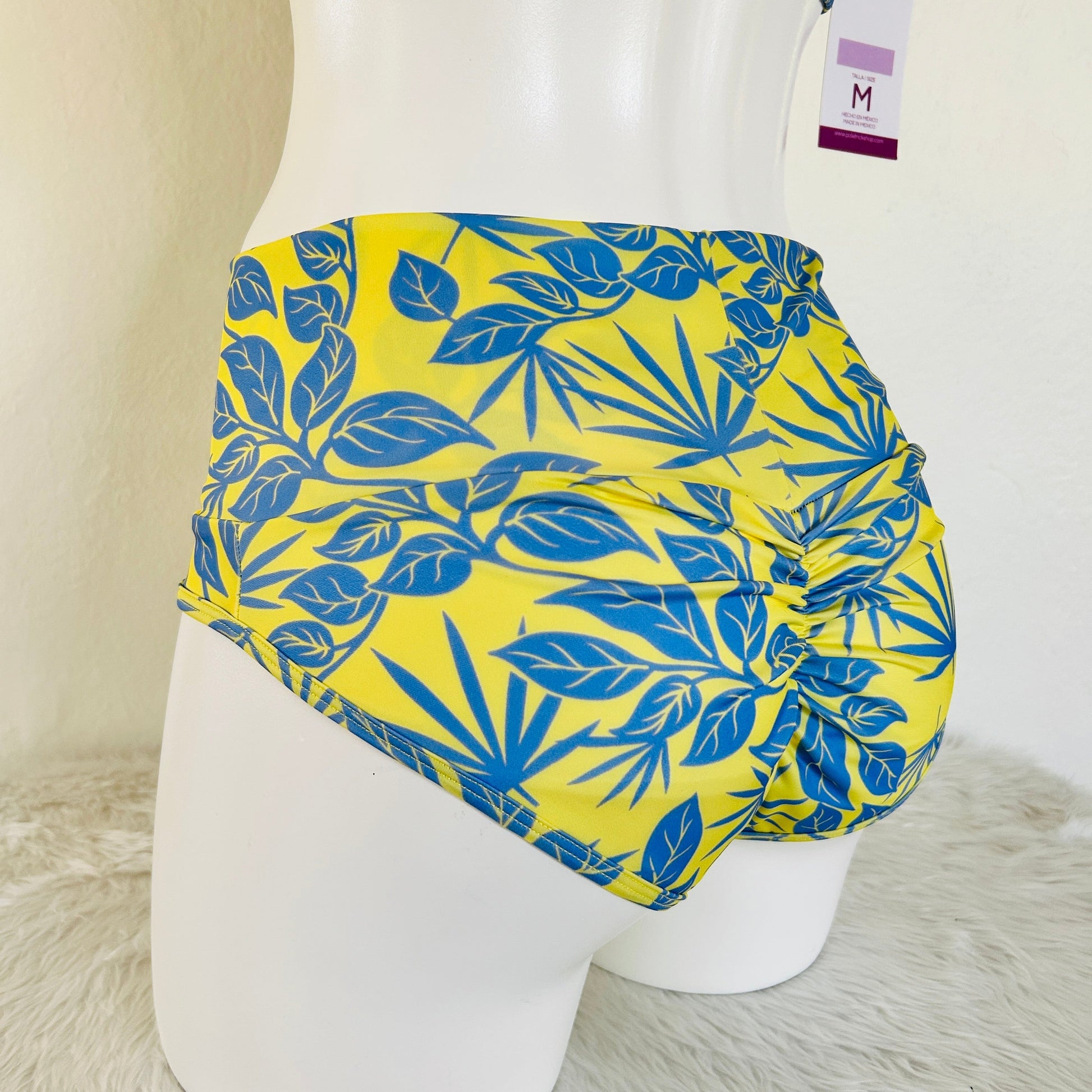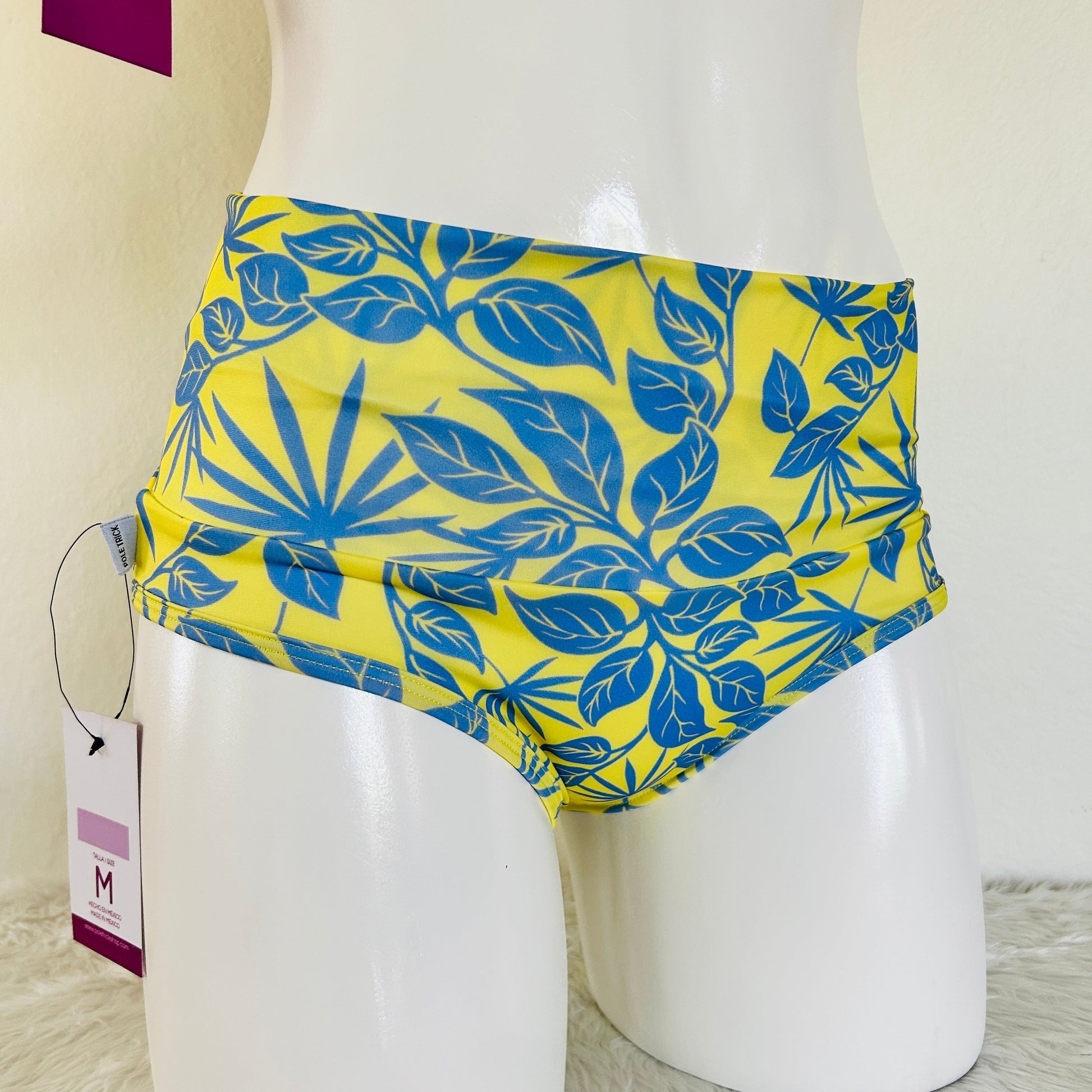Cachetero de pretina alta con estampado tropical en tonos amarillo y azul.