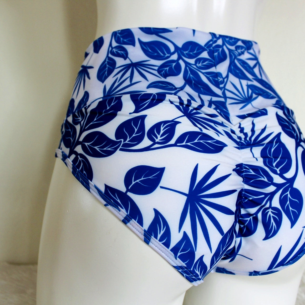 Cachetero con pretina alta y estampado tropical de hojas en tonos azul y blanco.