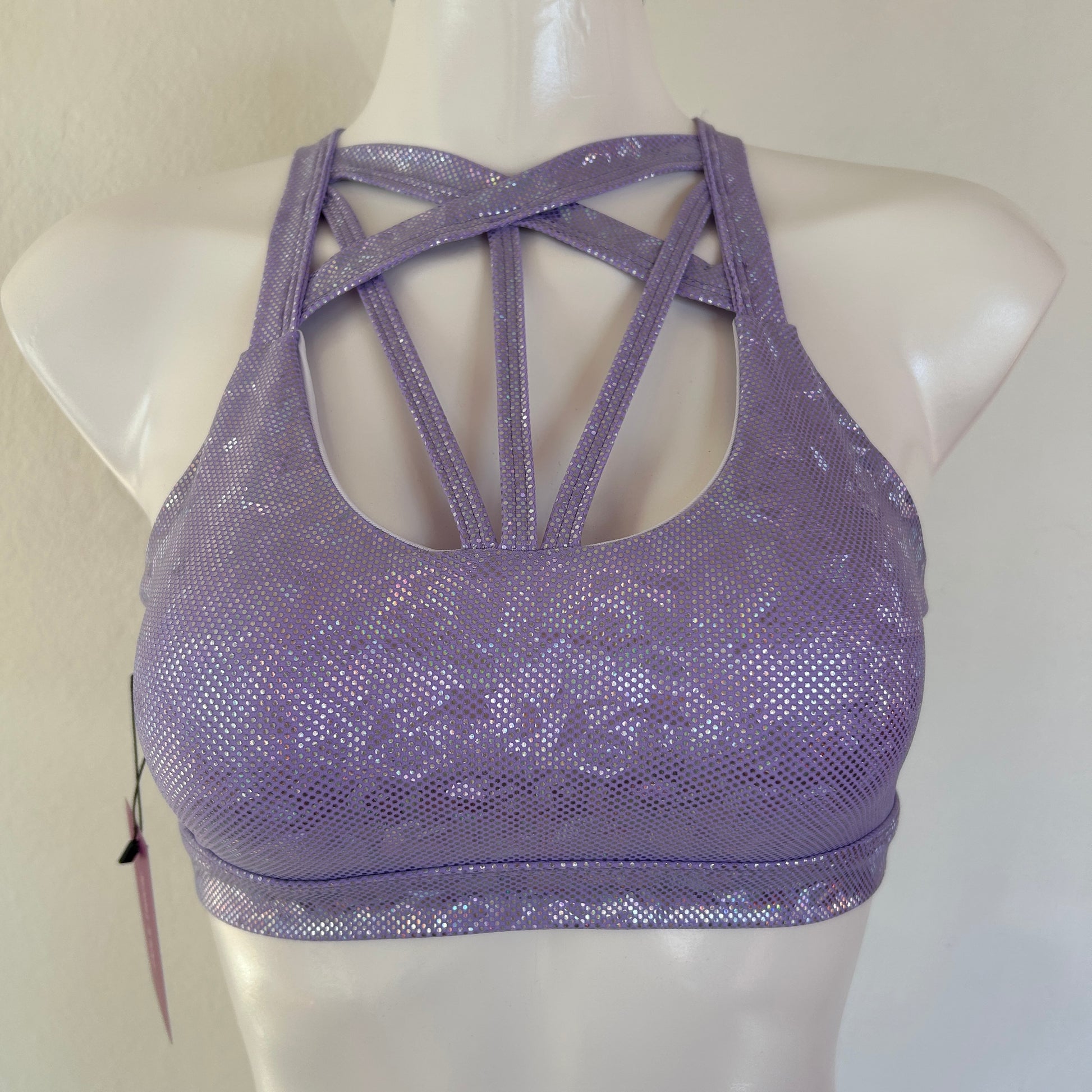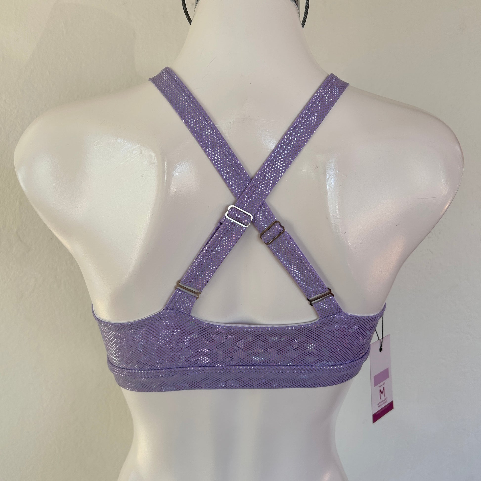 El Top Estrella combina el brillo iridiscente del acabado metálico con un diseño estructural de tiras que realza el pecho y brinda soporte firme.
