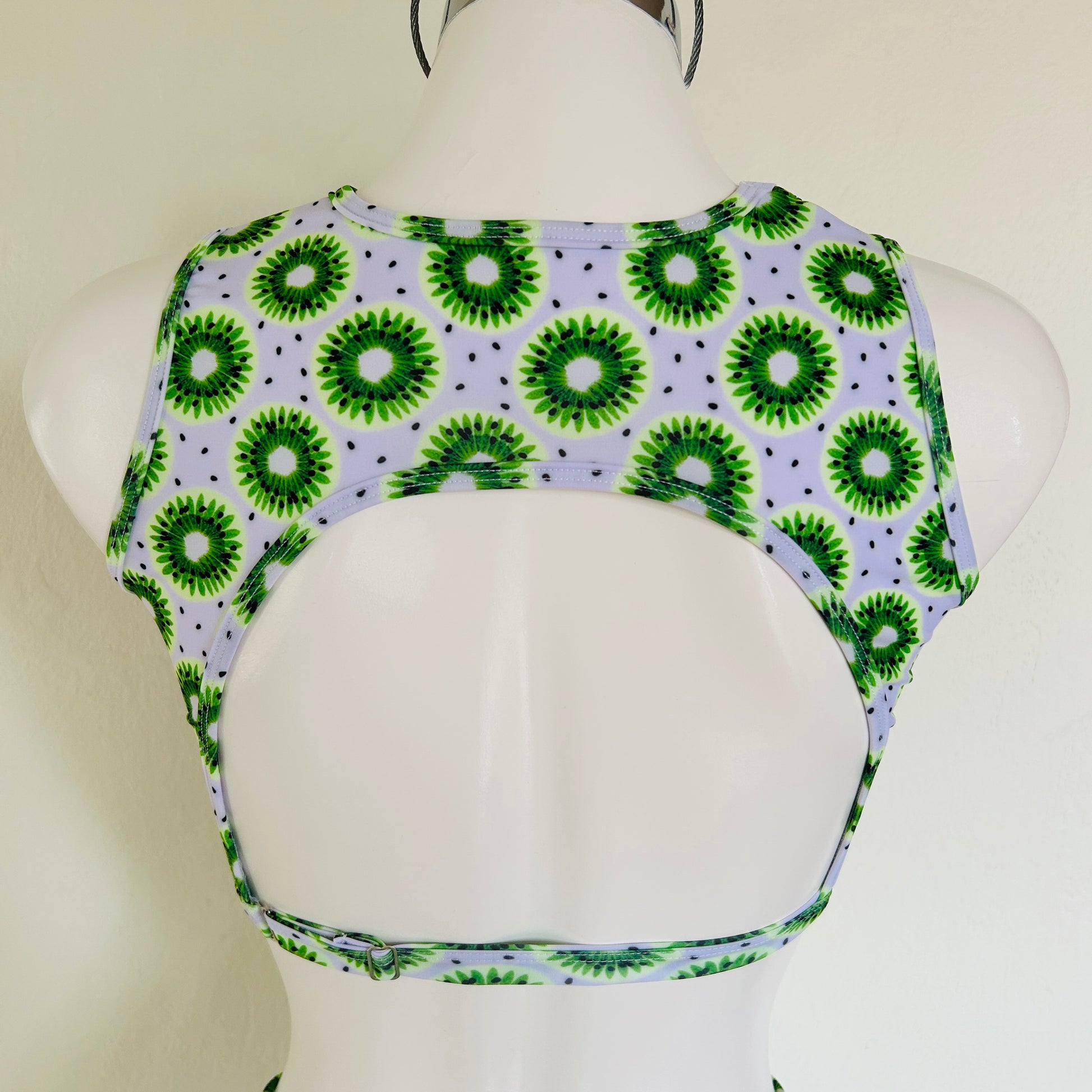 El Top Mónica es una pieza atrevida y sofisticada. Su combinación de print de kiwis con malla negra aporta un look moderno y sensual sin sacrificar soporte.
