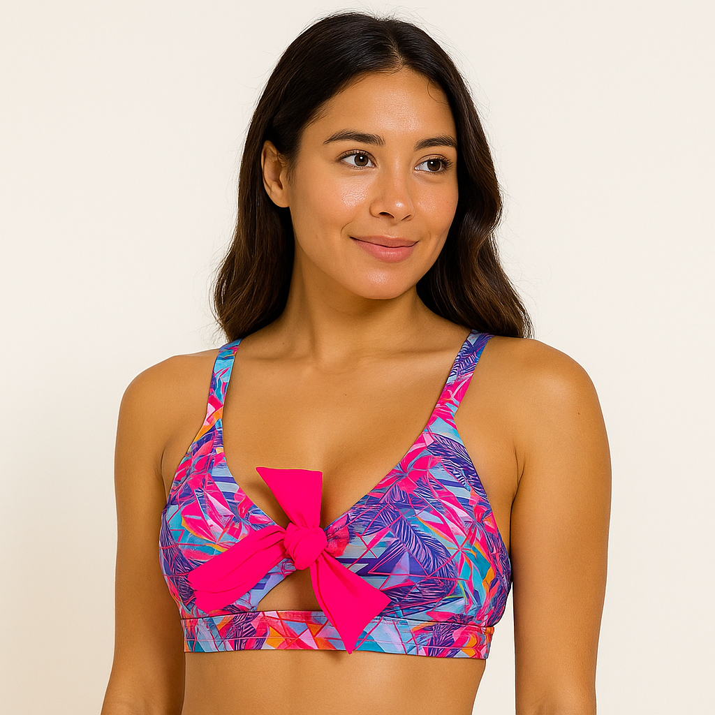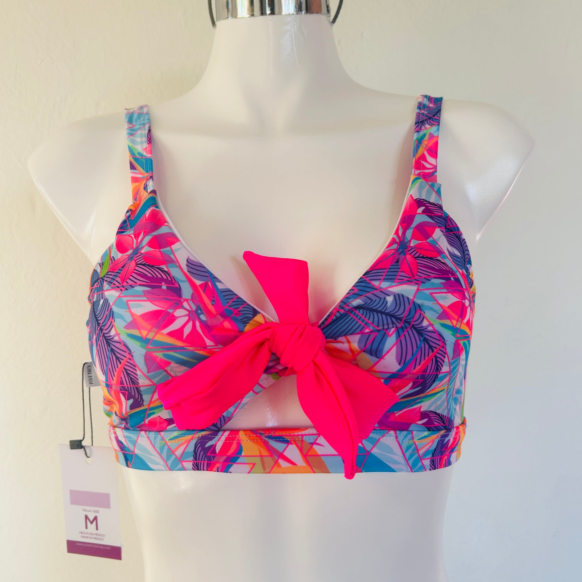 Su diseño con moño al frente resalta el busto con un toque femenino y divertido, mientras que su tela deportiva de alta resistencia te acompaña en cualquier disciplina: pole dance, fitness, yoga o natación.