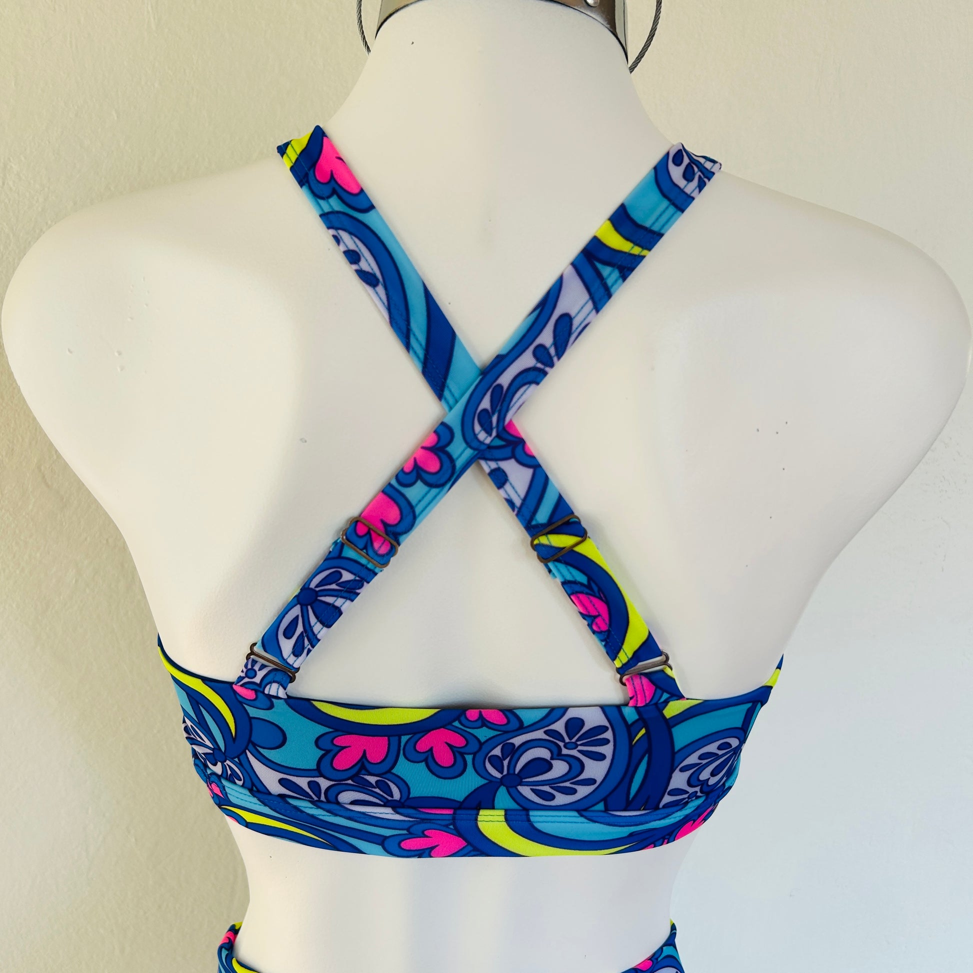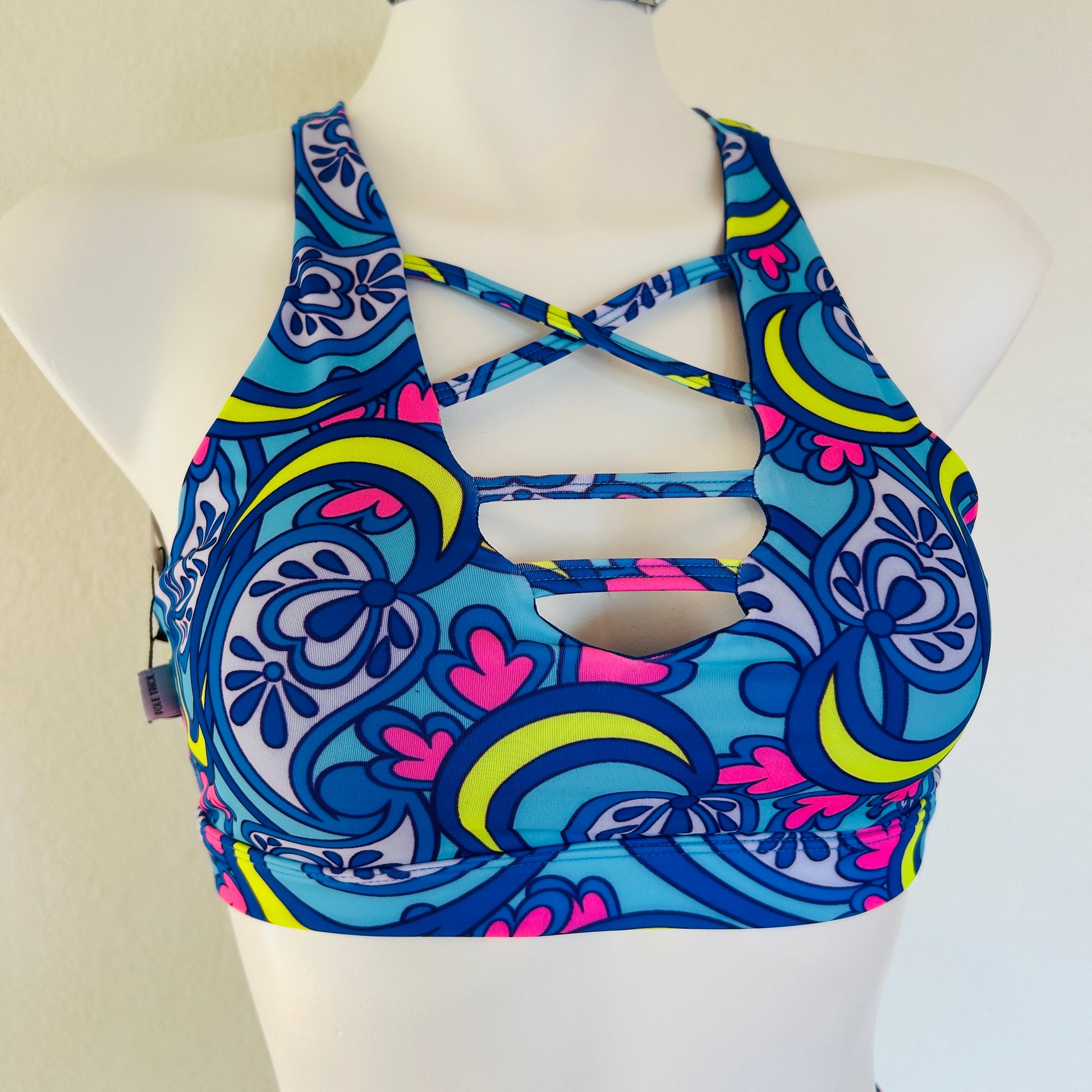 Su estampado en tonos azules con acentos vibrantes crea un efecto visual hipnótico que resalta en el pole. El diseño de tiras cruzadas en el escote no solo aporta un toque sensual, sino que también brinda soporte y ajuste seguro durante entrenamientos, combos o coreografías.